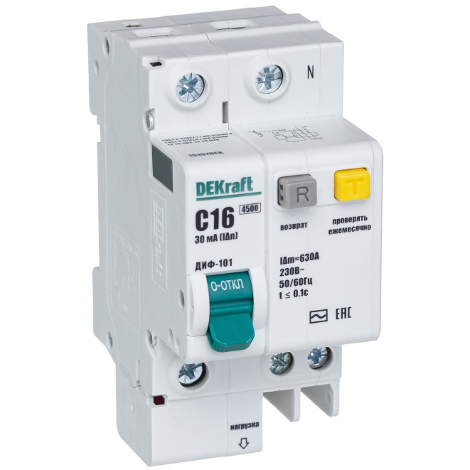 Выключатель автоматический дифференциальный АВДТ 1п+N 16А 30мА С ДИФ-101 4.5кА DEKraft