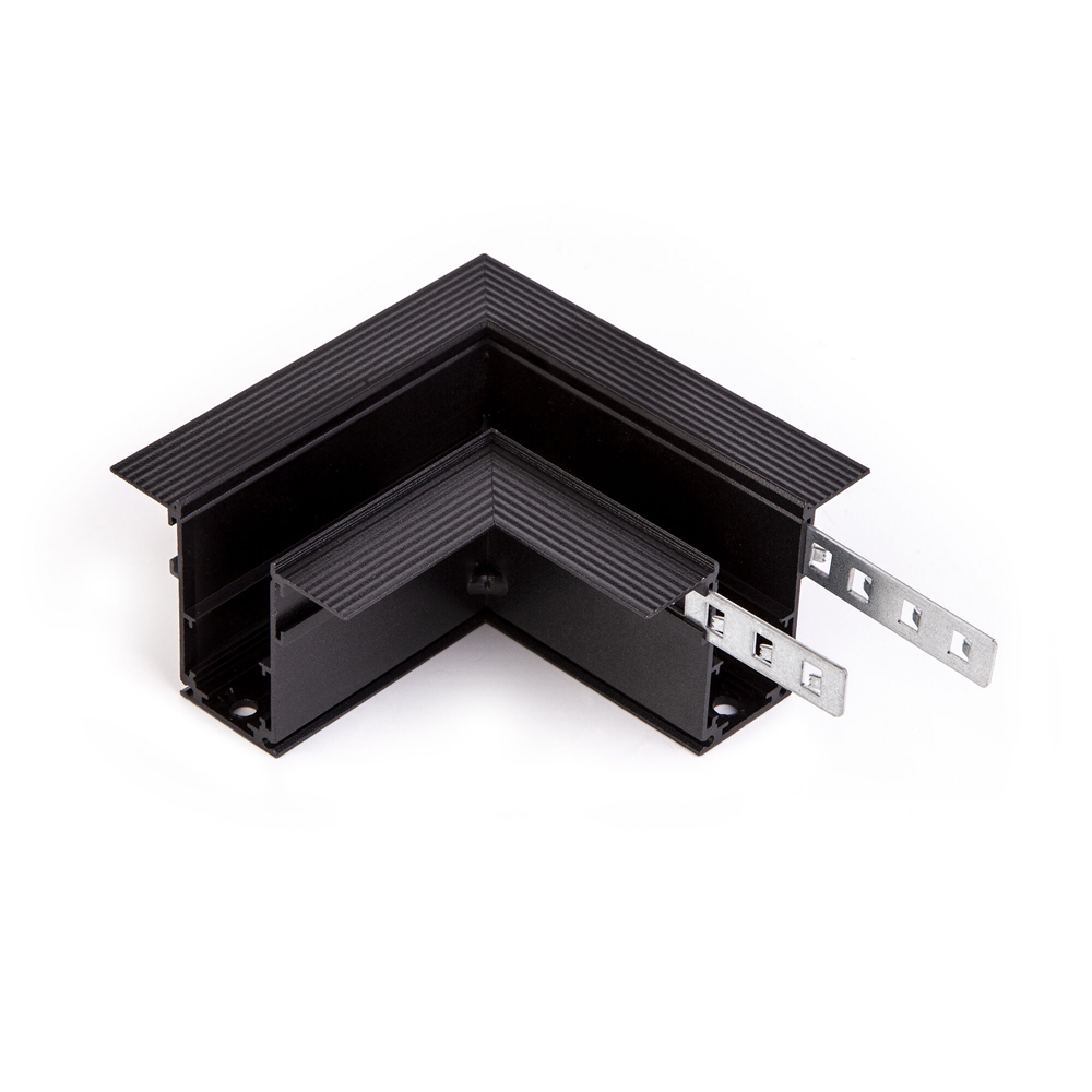 Коннектор угловой черный для встаиваемого шинопровода Slim Magnetic. Служит для соединения встраиваемых шинопроводов в одной плоскости под прямым углом 90°.