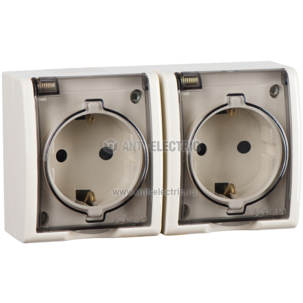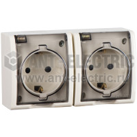 Розетка двойная IP54 с крышкой, заземлением и шторками Schuko 2x2Р+Е 16A 250В~ цвета слоновая кость