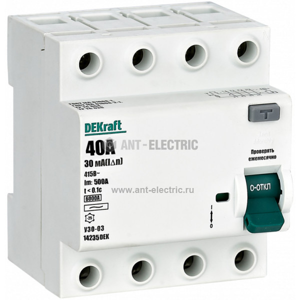 УЗО ВДТ 4P 40А 30мА тип AC 6кА УЗО-03