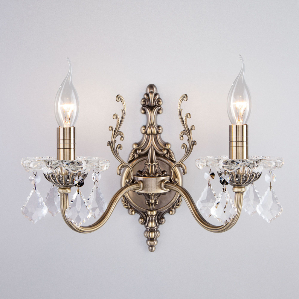 Бра с хрусталем 3281/2 античная бронза/прозрачный хрусталь Strotskis двухрожковый станет ярким световым акцентом в классических интерьерах и создаст качественное освещение на площади 10 м². Эффектные чаши подсвечников украшены хрустальными подвесками, которые искрятся в лучах света, наполняя помещение выразительным блеском. В качестве источника света используются сменные лампы типа свеча на ветру с цоколем E14. Патрон рассчитан на максимальную мощность ламп накаливания 60 Вт.