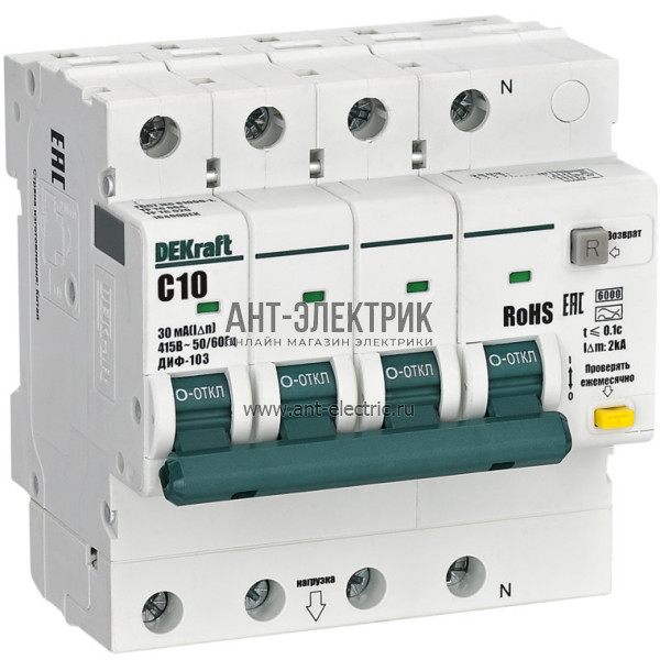 Выключатель автоматический дифференциальный 3P+N 10А 30мА AC х-ка C ДИФ-103 6кА