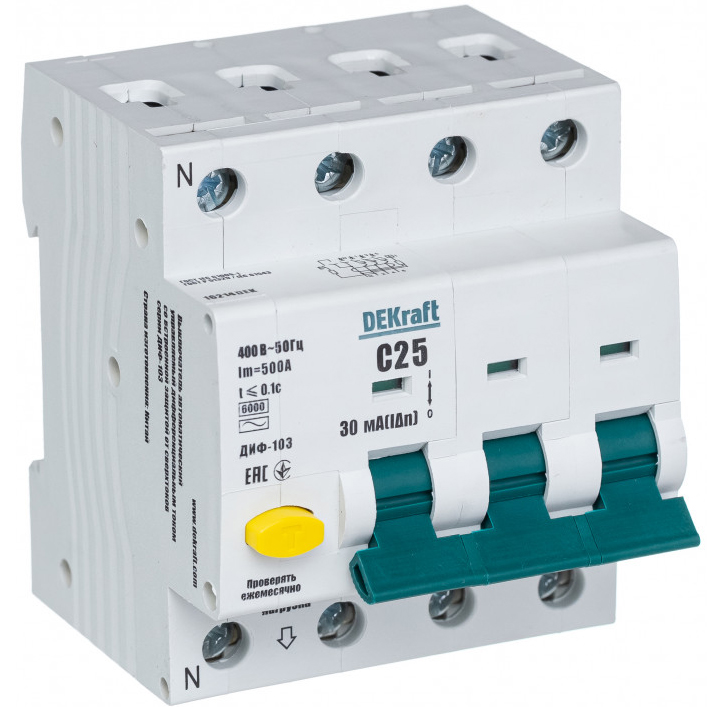 Выключатель автоматический дифференциальный 3Р+N 25А 30мА тип AC х-ка С ДИФ-103 6кА (16214DEK)