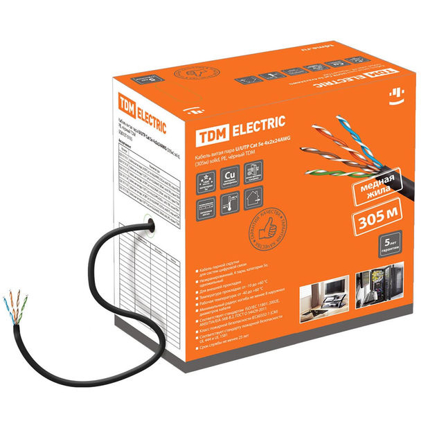 Кабель витая пара U/UTP Cat 5e 4х2х24AWG (305м) solid, PE, чёрный TDM