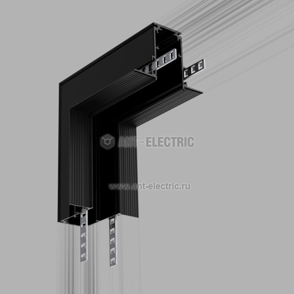 Коннектор угловой черный для встаиваемого шинопровода Slim Magnetic. Служит для соединения встраиваемых шинопроводов в двух плоскостях под прямым углом 90°.