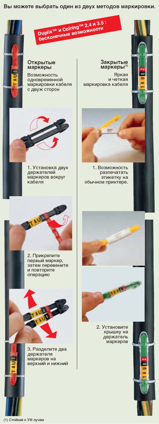 Закрепляются в держателе "Duplix", который крепится на маркируемый объект с помощью кабельных хомутов.