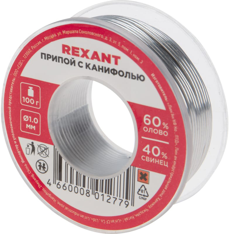 Припой с канифолью, 100 г, 1.0 мм, (олово 60%, свинец 40%), REXANT