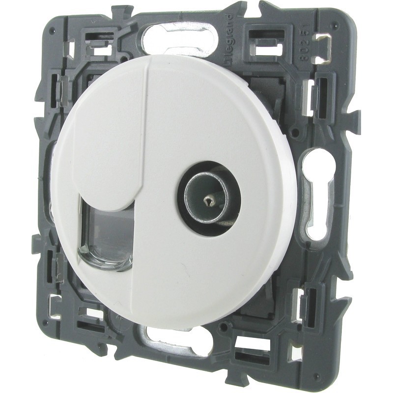 Мультимедийная розетка, собирающаяся из розетки с коннектором LCS2 быстрого монтажа для подключения компьютера, телефона и розетки ТВ затухание 1,5dB (дБ) одиночная, тип подключения звезда 2400 МГц для штекеров 9,5 мм белого цвета единственная