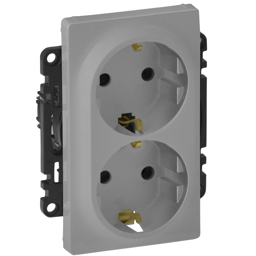 Розетка "евро" Валена Лайф электрическая с заземлением с/з немецкий стандарт двойная серебристая со штроками (с защитными штроками)