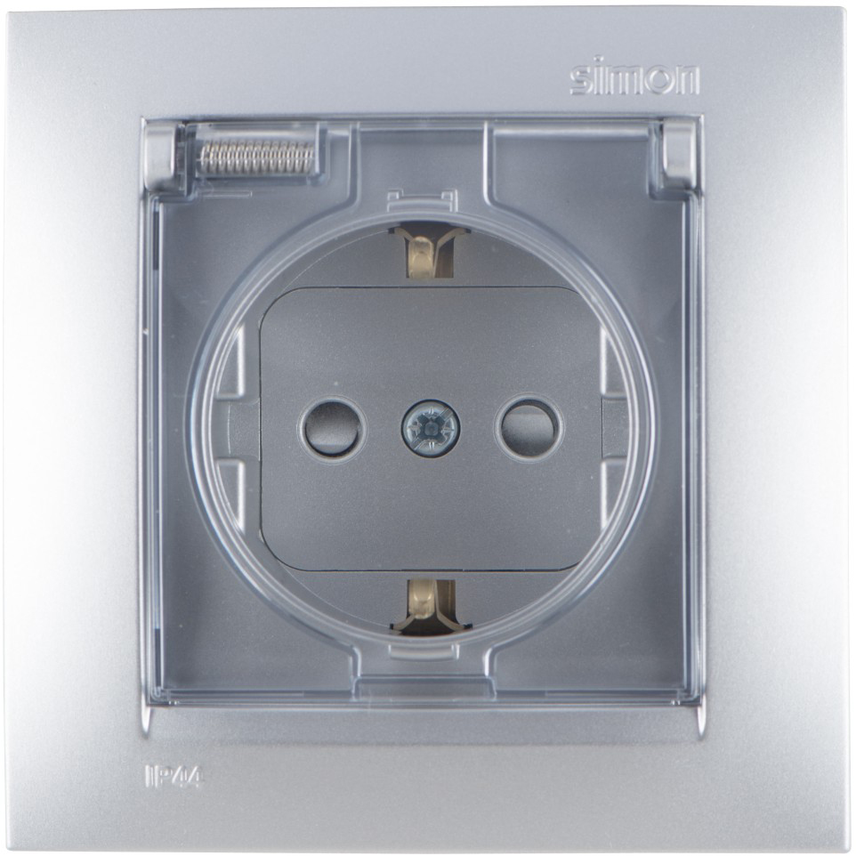 Simon 15 Алюминий Розетка с/з, со шторками, с крышкой, IP44, 16А, 250В, винт.зажим