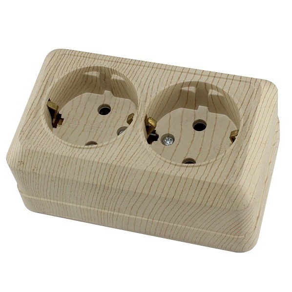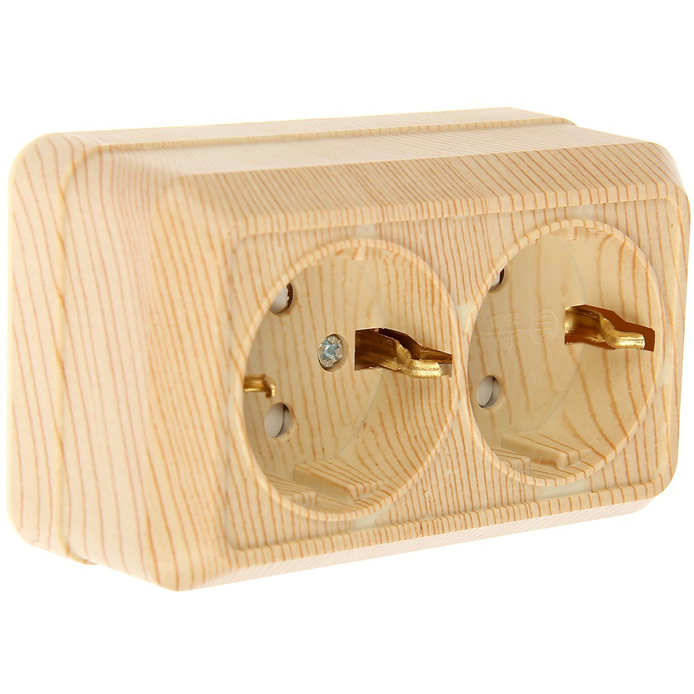 Розетка со шторками "Ладога" двойная 2П+З открытой установки с з/ш IP20 16А (сосна) под светлое дерево с защитными штроками