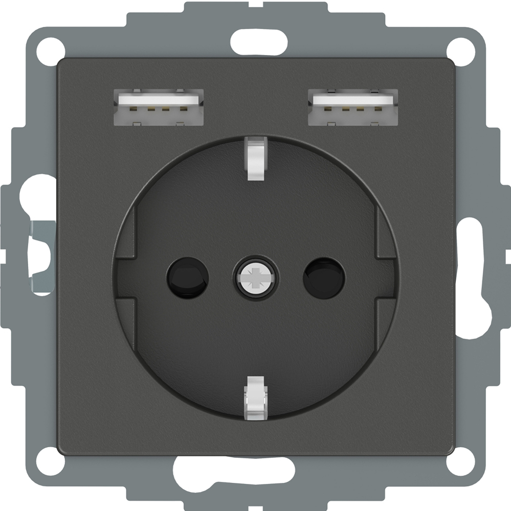 Розетка Merten System M с/з с защитными шторками безвинт.зажим 2К+З с 2 USB c зарядным устройством 2,4 A (чёрная)