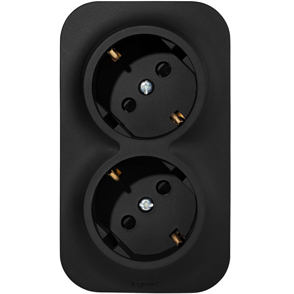Розеточный блок двойной (розетка двойная) с заземлением -Legrand Quteo - с предварительным подключением со шторками IP20 16А 250В винтовые зажимы накладной монтаж - чёрный матовый