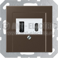 Розетка USB двойная для зарядки тип А+С, 2x700мA, винтовой зажим, мокко A569PLTMO + USB15CAWW