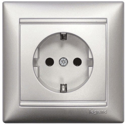 Розетка "евро" Валена электрическая с заземлением с/з немецкий стандарт алюминиевая серебристая в комплекте с рамкой (в сборе)