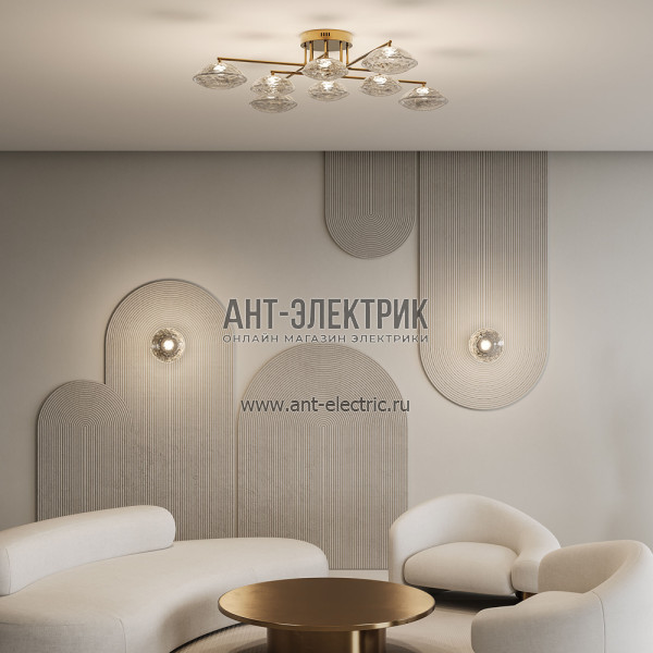 В линейке Ripple представлена потолочная люстра на 8 плафонов, подходящая для интерьеров с низкими потолками, а также настенный светильник.