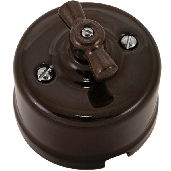 Выключатель фарфоровый поворотный с ручкой (бантик) 10А коричневый серии "Болонь" накладной одноклавишный , винтажный под старину